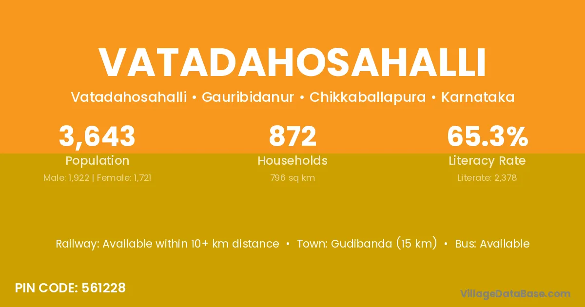 Gudibanda (15 km) is the nearest town to Vatadahosahalli village for major economic activities and is located approximately 15 km away.