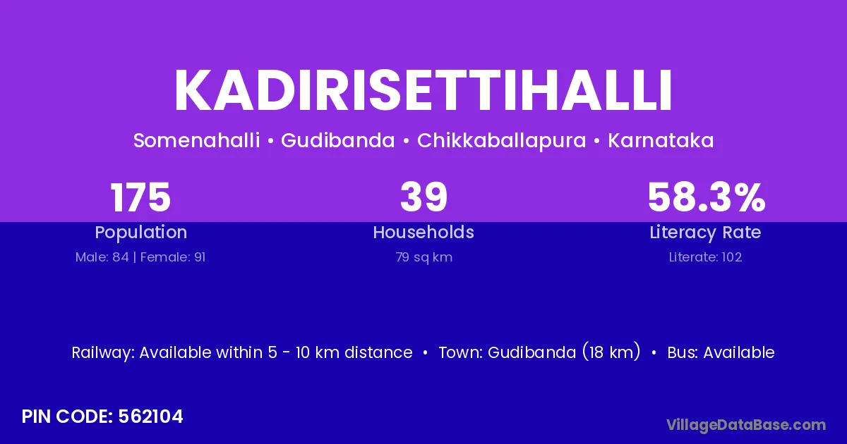 Gudibanda (18 km) is the nearest town to Kadirisettihalli village for major economic activities and is located approximately 18 km away.