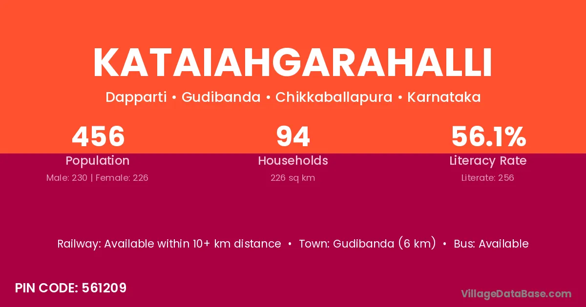 Kataiahgarahalli village has a total population of 456 people, of which 230 are males and 226 are females.