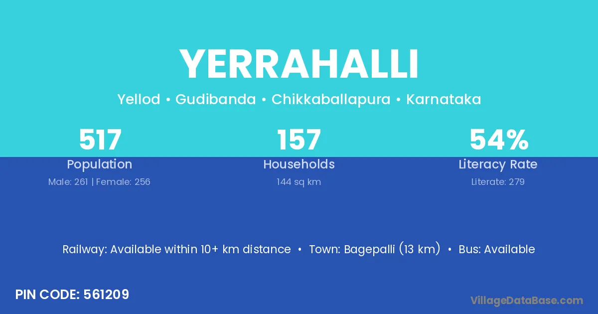 Bagepalli (13 km) is the nearest town to Yerrahalli village for major economic activities and is located approximately 13 km away.