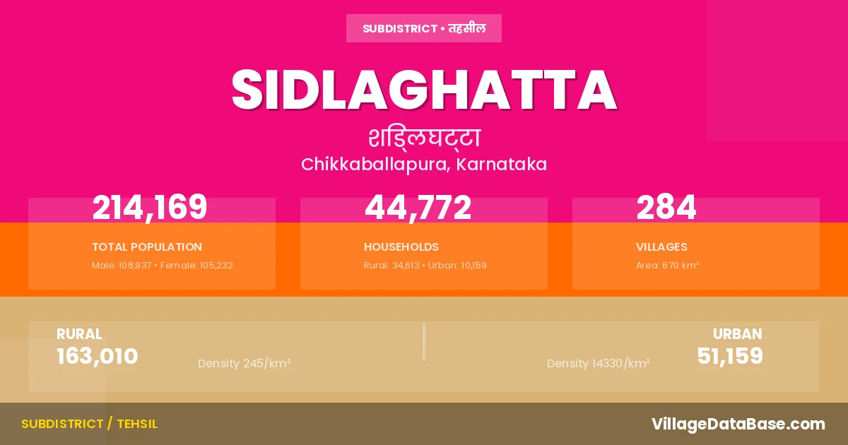 According to the 2011 census The total area of Sidlaghatta Taluka is 670 km², with a population of 214169 people. The population density is 320 inhabitants per square kilometre, and there are approximately 44772 houses in the sub district.