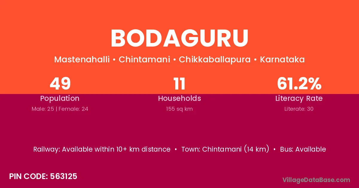 Sidlaghatta (5 km) is the nearest town to Bodaguru village for major economic activities and is located approximately 5 km away.