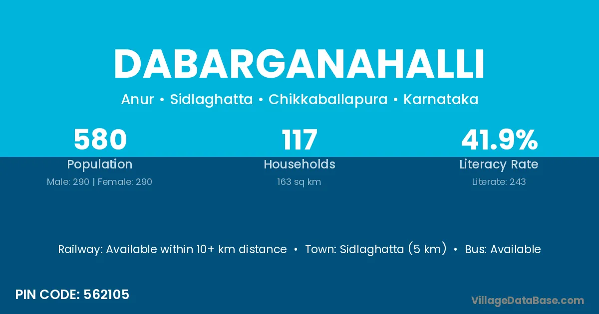 Dabarganahalli village has a total population of 580 people, of which 290 are males and 290 are females.