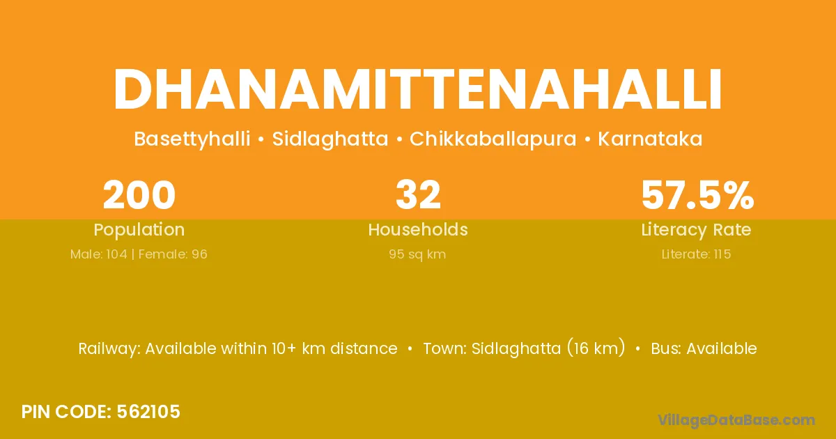 Sidlaghatta (16 km) is the nearest town to Dhanamittenahalli village for major economic activities and is located approximately 16 km away.