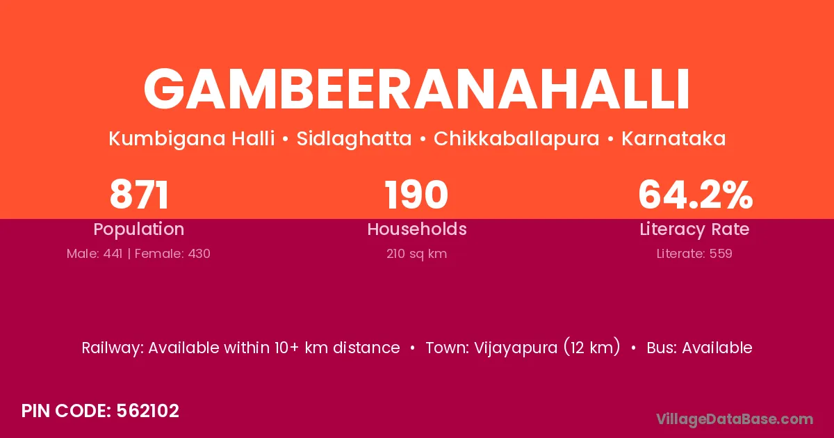 Vijayapura (12 km) is the nearest town to Gambeeranahalli village for major economic activities and is located approximately 12 km away.