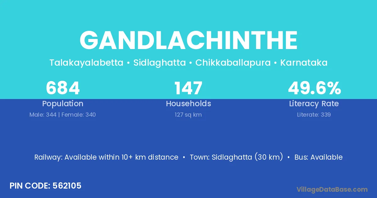 Sidlaghatta (30 km) is the nearest town to Gandlachinthe village for major economic activities and is located approximately 30 km away.