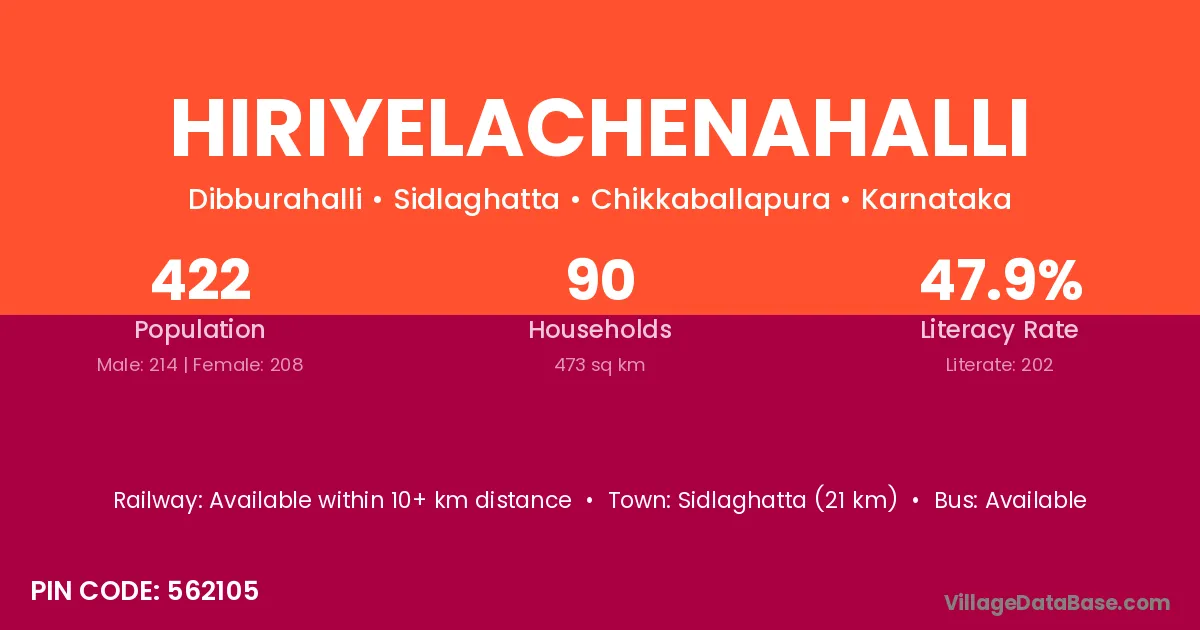 Sidlaghatta (21 km) is the nearest town to Hiriyelachenahalli village for major economic activities and is located approximately 21 km away.