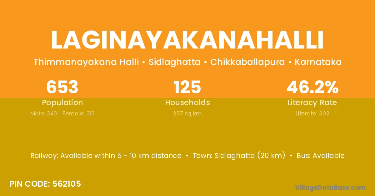 Sidlaghatta (20 km) is the nearest town to Laginayakanahalli village for major economic activities and is located approximately 20 km away.