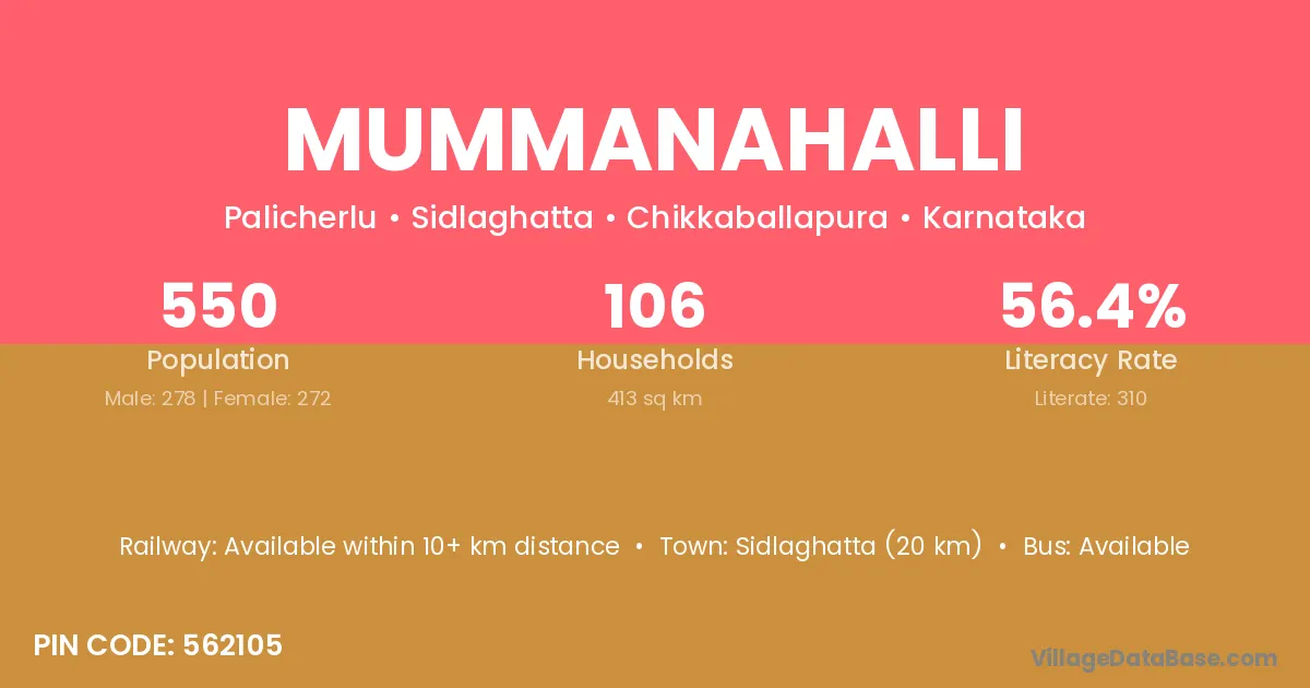 Mummanahalli village has a total population of 550 people, of which 278 are males and 272 are females.