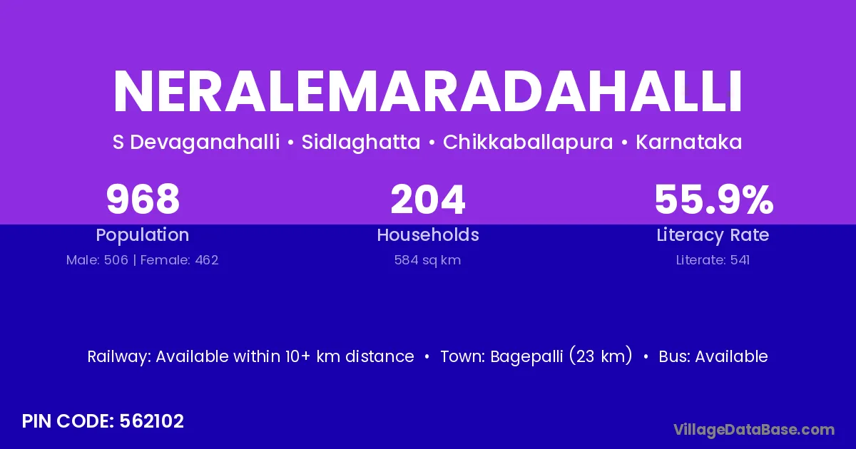 Bagepalli (23 km) is the nearest town to Neralemaradahalli village for major economic activities and is located approximately 23 km away.