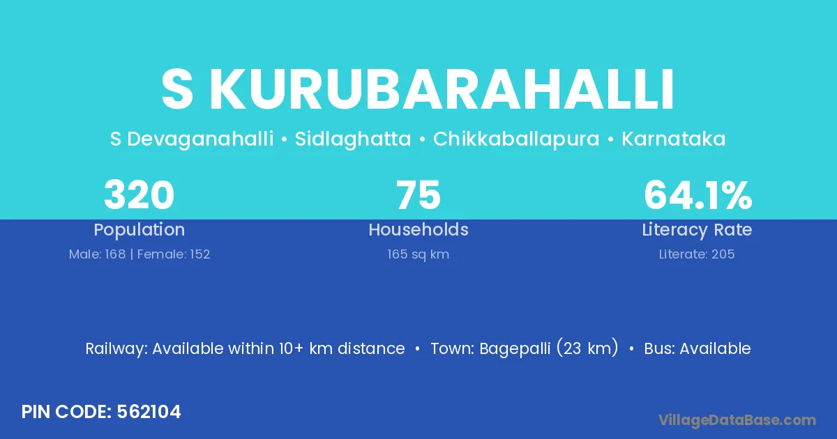 Bagepalli (23 km) is the nearest town to S Kurubarahalli village for major economic activities and is located approximately 23 km away.