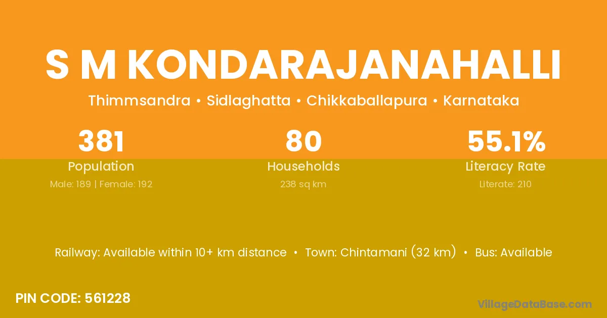 S M Kondarajanahalli village has a total population of 381 people, of which 189 are males and 192 are females.
