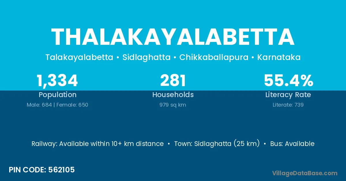Sidlaghatta (25 km) is the nearest town to Thalakayalabetta village for major economic activities and is located approximately 25 km away.
