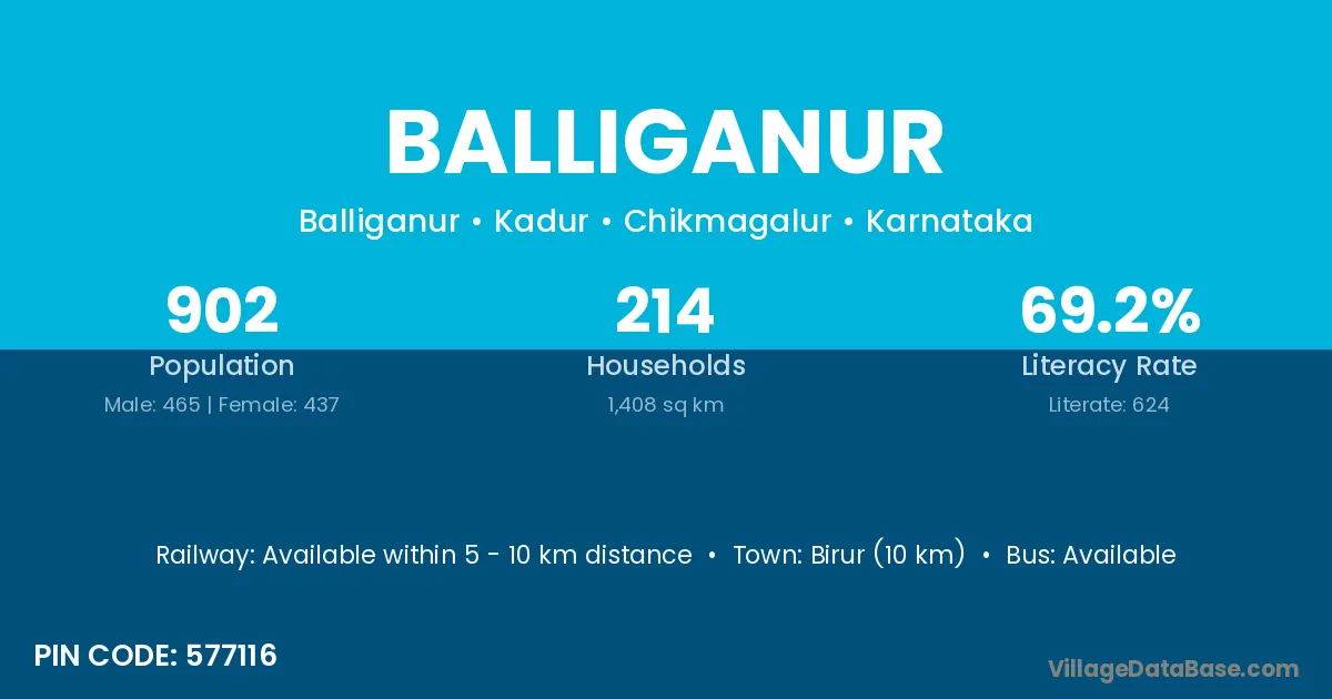 Birur (10 km) is the nearest town to Balliganur village for major economic activities and is located approximately 10 km away.