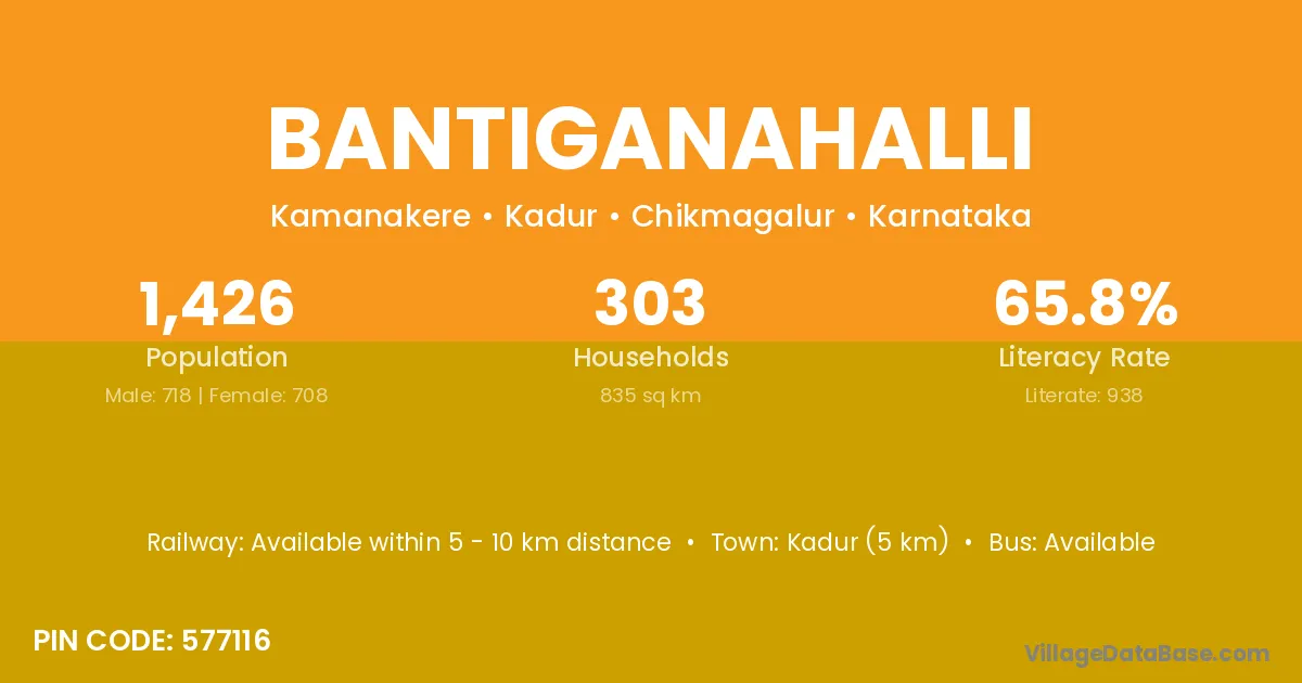 Kadur (5 km) is the nearest town to Bantiganahalli village for major economic activities and is located approximately 5 km away.