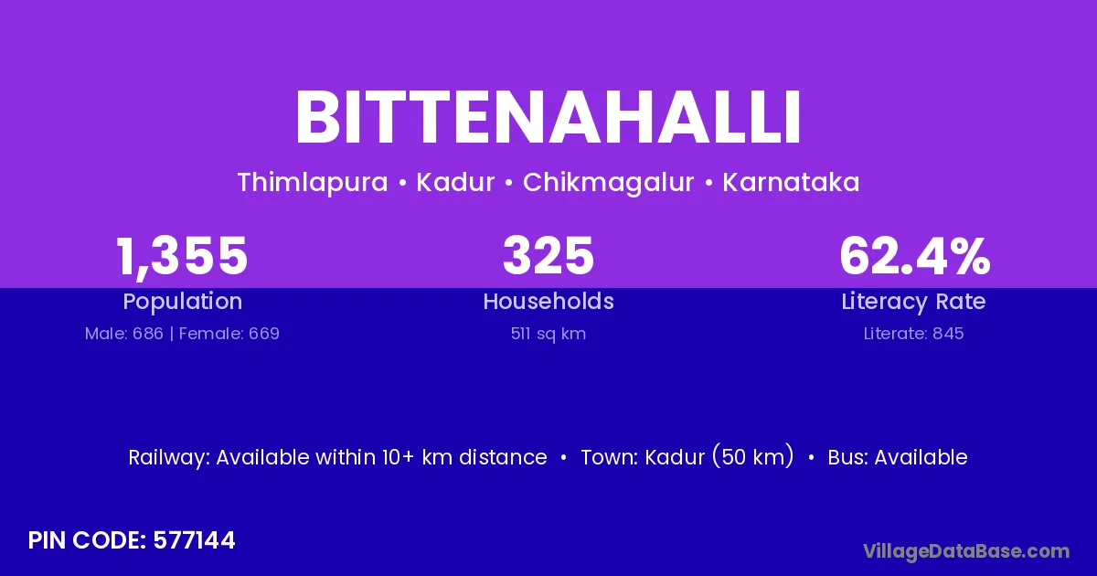 Kadur (50 km) is the nearest town to Bittenahalli village for major economic activities and is located approximately 50 km away.