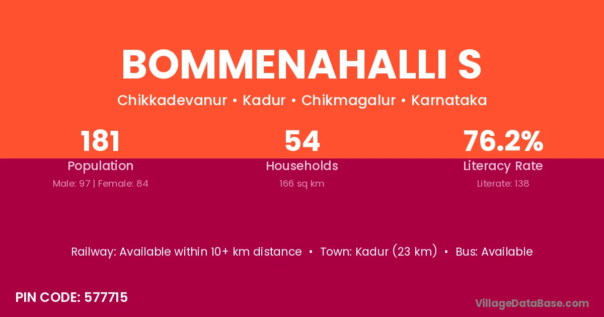 Bommenahalli S village has a total population of 181 people, of which 97 are males and 84 are females.