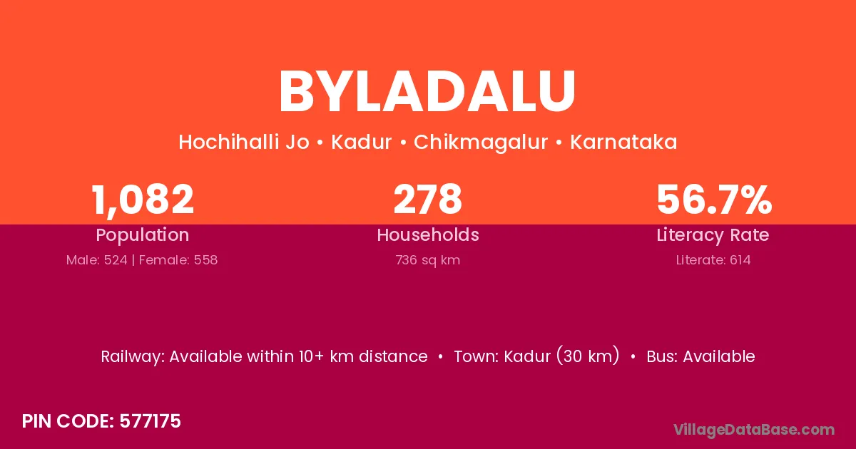 Kadur (30 km) is the nearest town to Byladalu village for major economic activities and is located approximately 30 km away.
