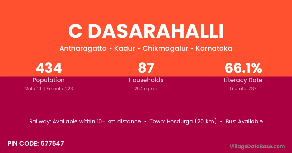 Hosdurga (20 km) is the nearest town to C Dasarahalli village for major economic activities and is located approximately 20 km away.