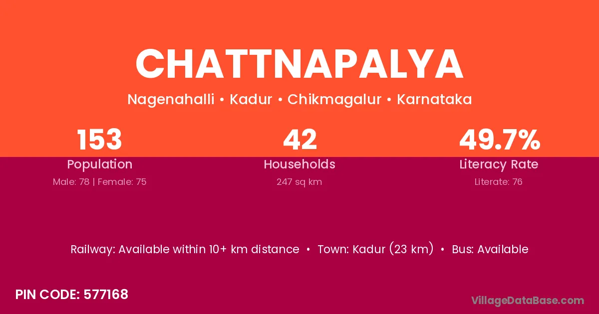 Kadur (23 km) is the nearest town to Chattnapalya village for major economic activities and is located approximately 23 km away.