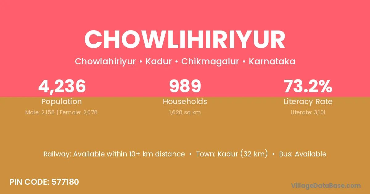 Kadur (32 km) is the nearest town to Chowlihiriyur village for major economic activities and is located approximately 32 km away.
