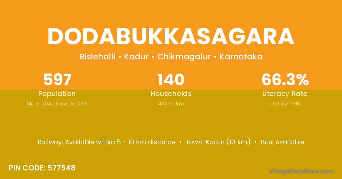 Kadur (10 km) is the nearest town to Dodabukkasagara village for major economic activities and is located approximately 10 km away.