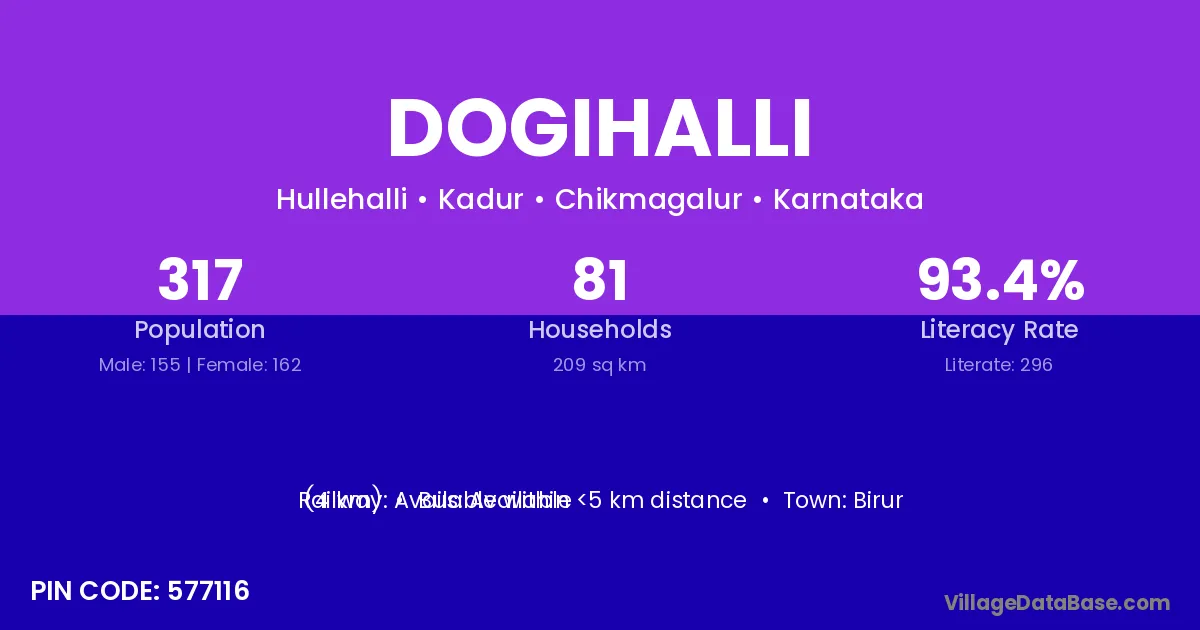Birur (4 km) is the nearest town to Dogihalli village for major economic activities and is located approximately 4 km away.