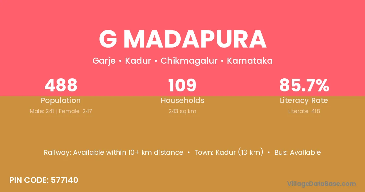 Kadur (13 km) is the nearest town to G Madapura village for major economic activities and is located approximately 13 km away.