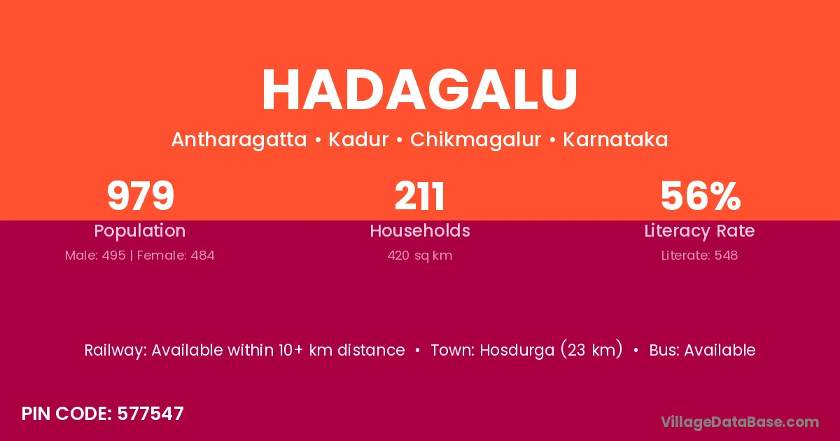 Hosdurga (23 km) is the nearest town to Hadagalu village for major economic activities and is located approximately 23 km away.