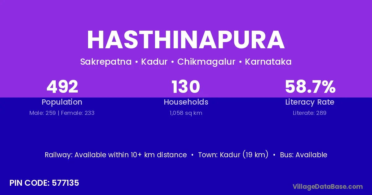 Kadur (19 km) is the nearest town to Hasthinapura village for major economic activities and is located approximately 19 km away.
