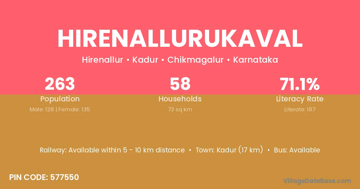 Hirenallurukaval village has a total population of 263 people, of which 128 are males and 135 are females.