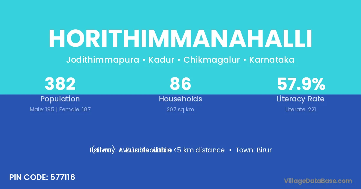 Horithimmanahalli village has a total population of 382 people, of which 195 are males and 187 are females.