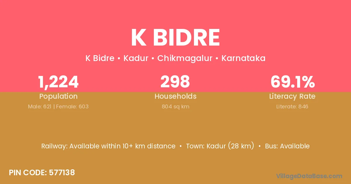 Kadur (28 km) is the nearest town to K Bidre village for major economic activities and is located approximately 28 km away.