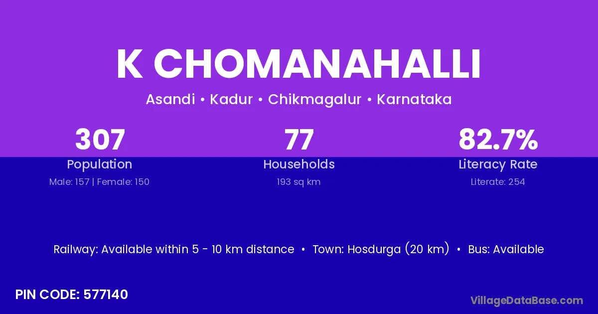 K Chomanahalli village has a total population of 307 people, of which 157 are males and 150 are females.