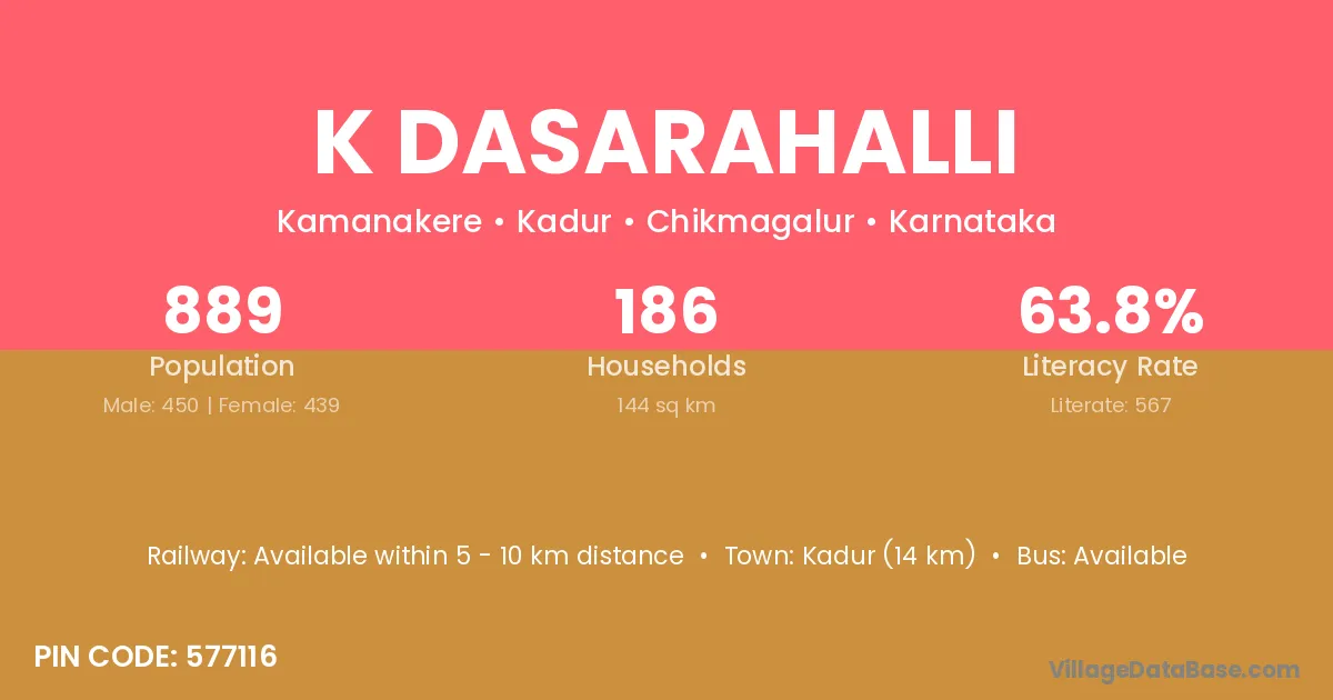 K Dasarahalli village has a total population of 889 people, of which 450 are males and 439 are females.