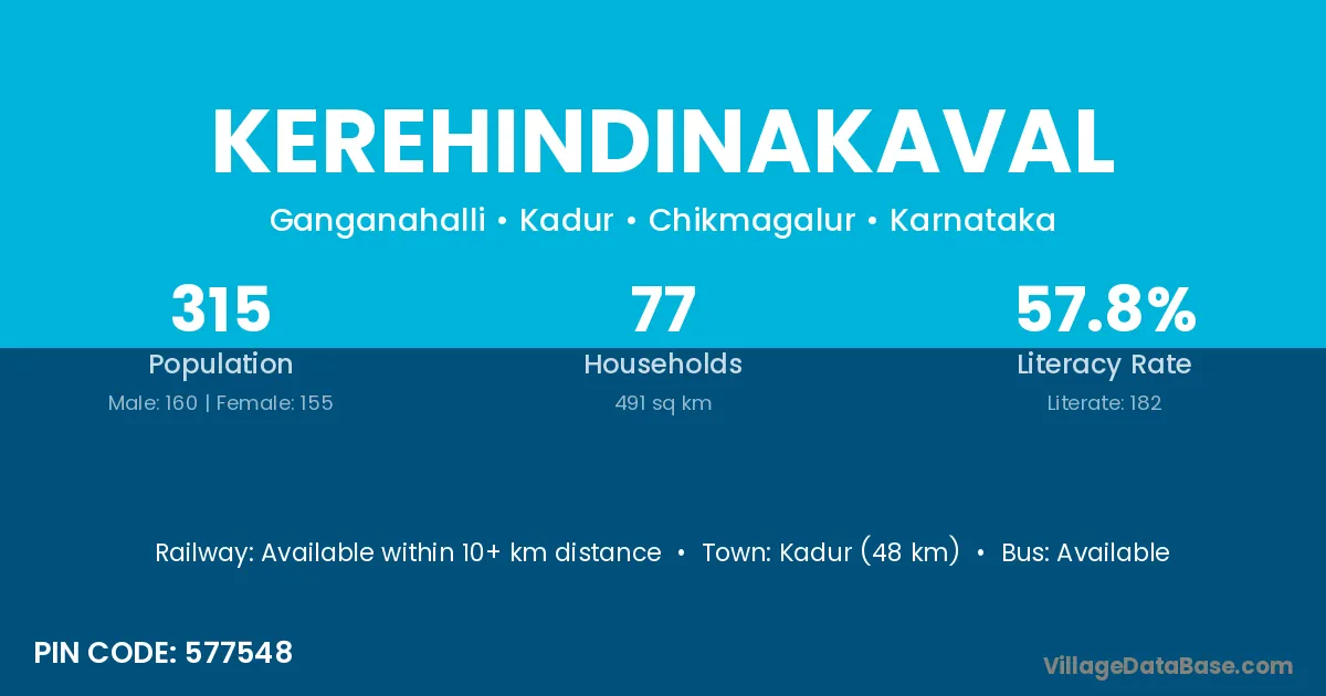 Kadur (48 km) is the nearest town to Kerehindinakaval village for major economic activities and is located approximately 48 km away.