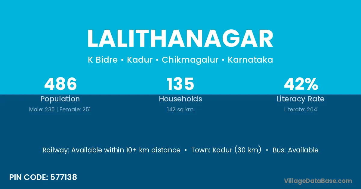 Kadur (30 km) is the nearest town to Lalithanagar village for major economic activities and is located approximately 30 km away.