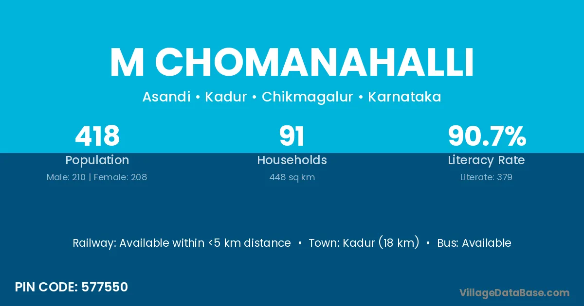 Kadur (18 km) is the nearest town to M Chomanahalli village for major economic activities and is located approximately 18 km away.