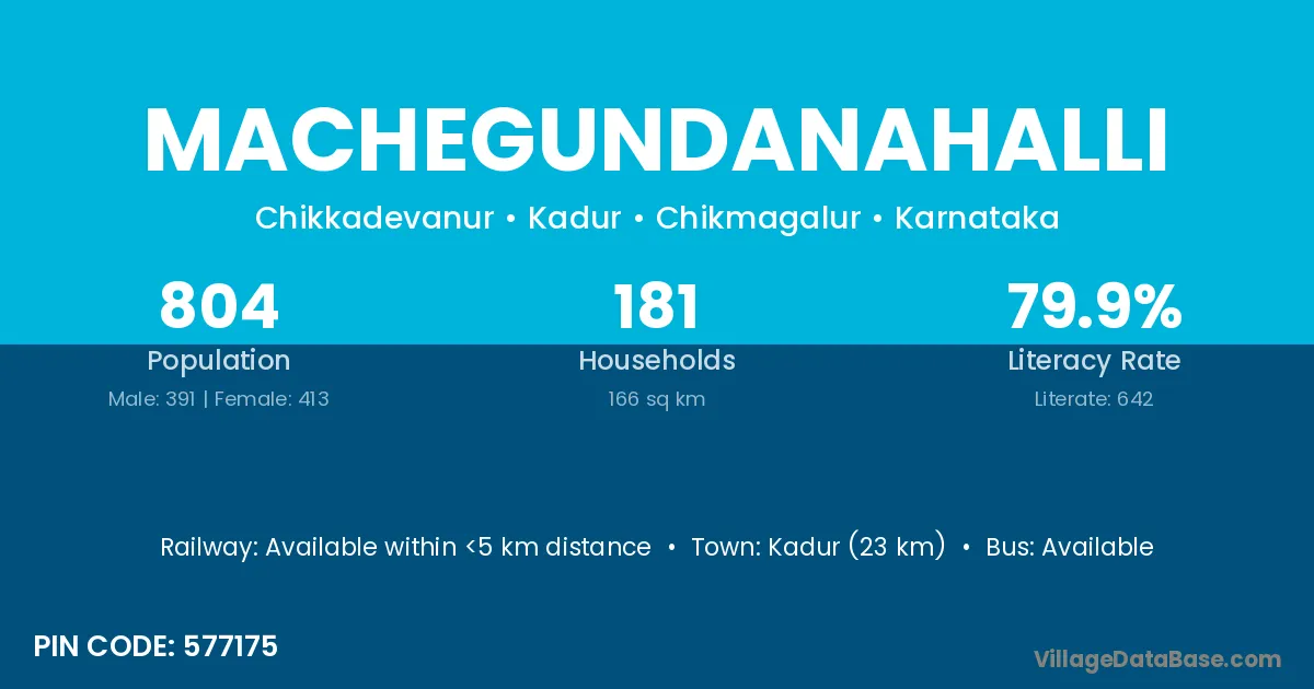 Kadur (23 km) is the nearest town to Machegundanahalli village for major economic activities and is located approximately 23 km away.