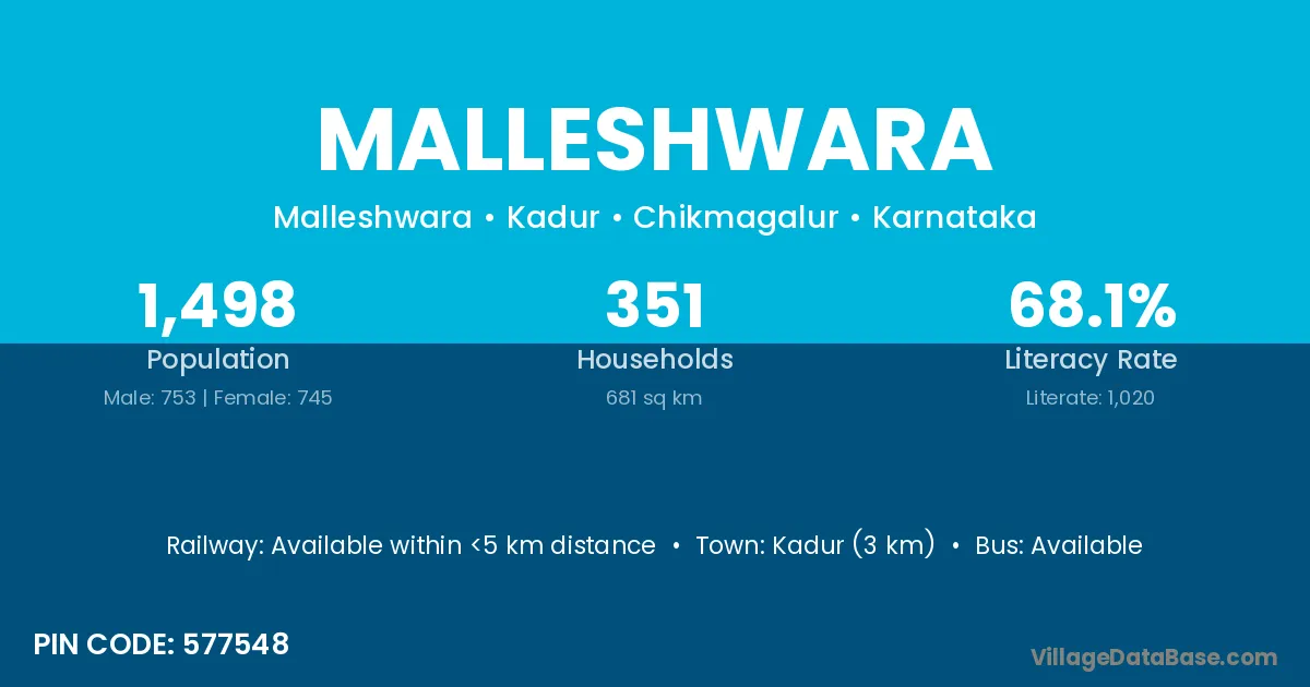 Malleshwara village has a total population of 1,498 people, of which 753 are males and 745 are females.