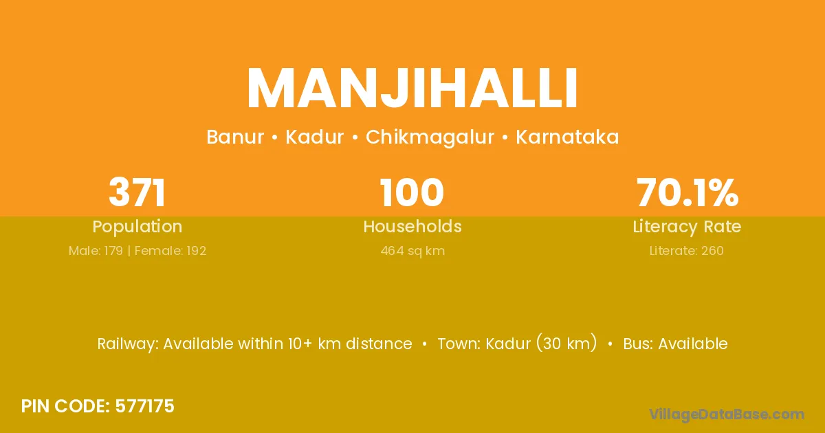 Kadur (30 km) is the nearest town to Manjihalli village for major economic activities and is located approximately 30 km away.