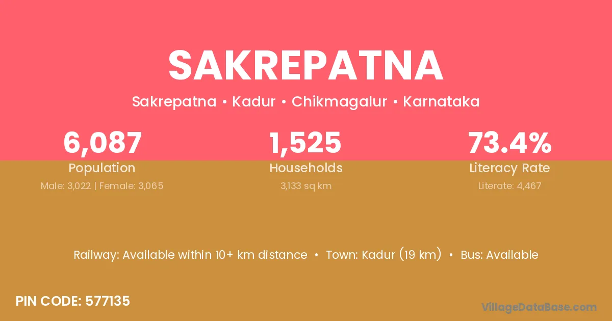 Kadur (19 km) is the nearest town to Sakrepatna village for major economic activities and is located approximately 19 km away.