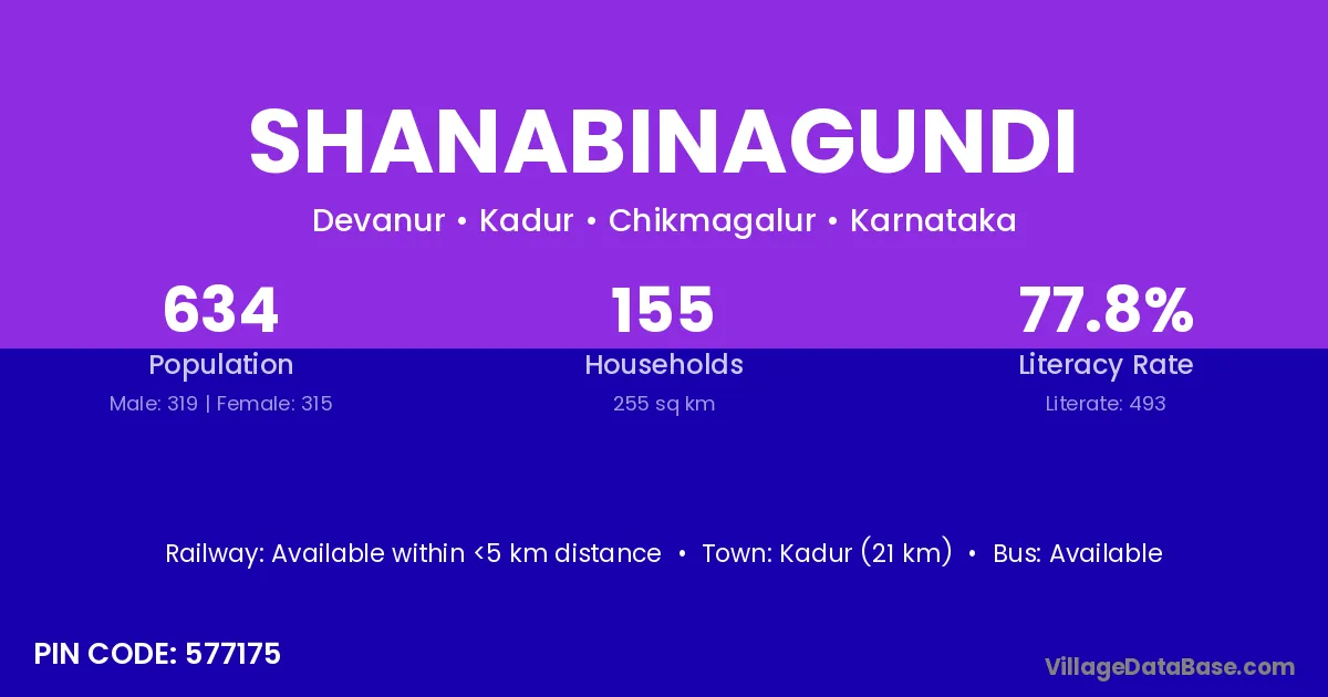 Kadur (21 km) is the nearest town to Shanabinagundi village for major economic activities and is located approximately 21 km away.