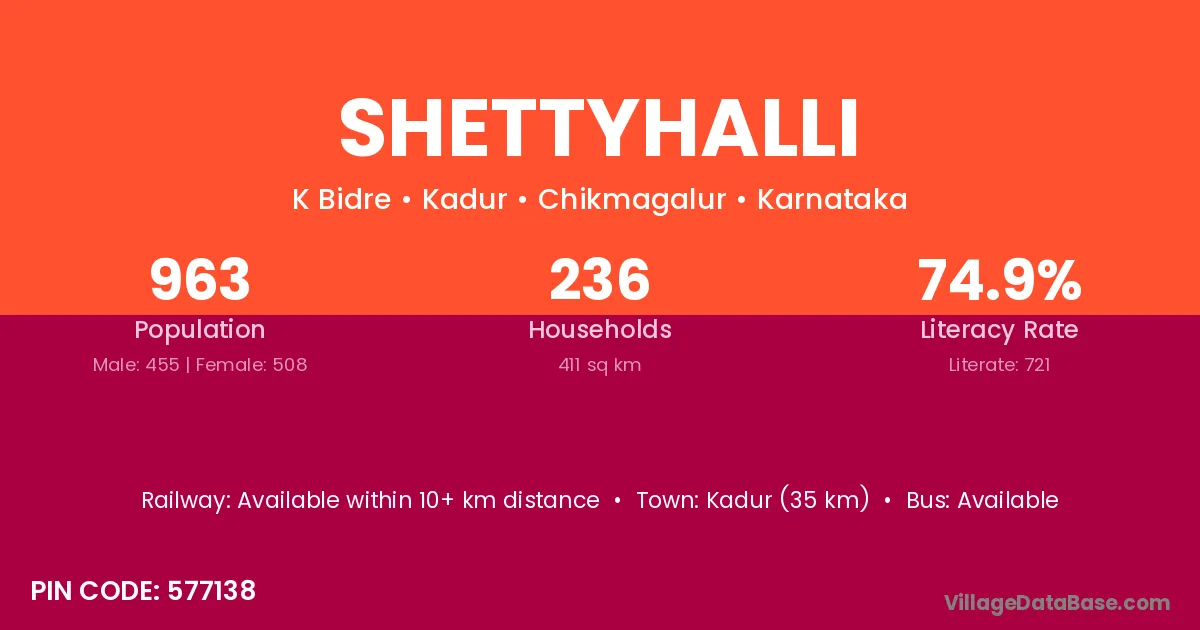 Shettyhalli village has a total population of 963 people, of which 455 are males and 508 are females.