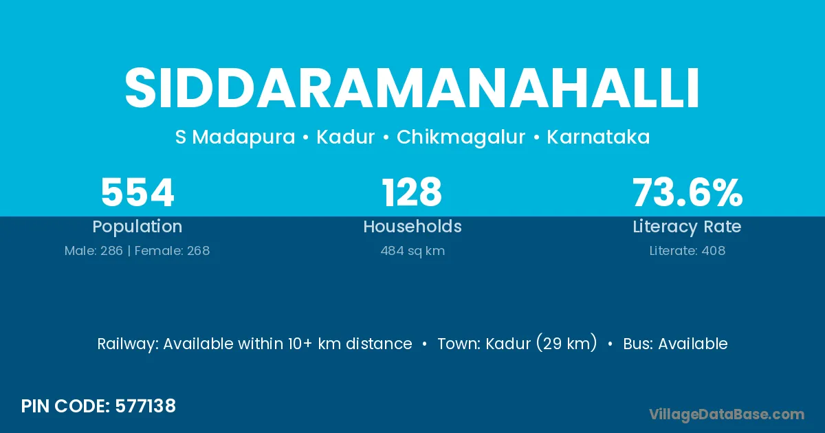 Kadur (29 km) is the nearest town to Siddaramanahalli village for major economic activities and is located approximately 29 km away.
