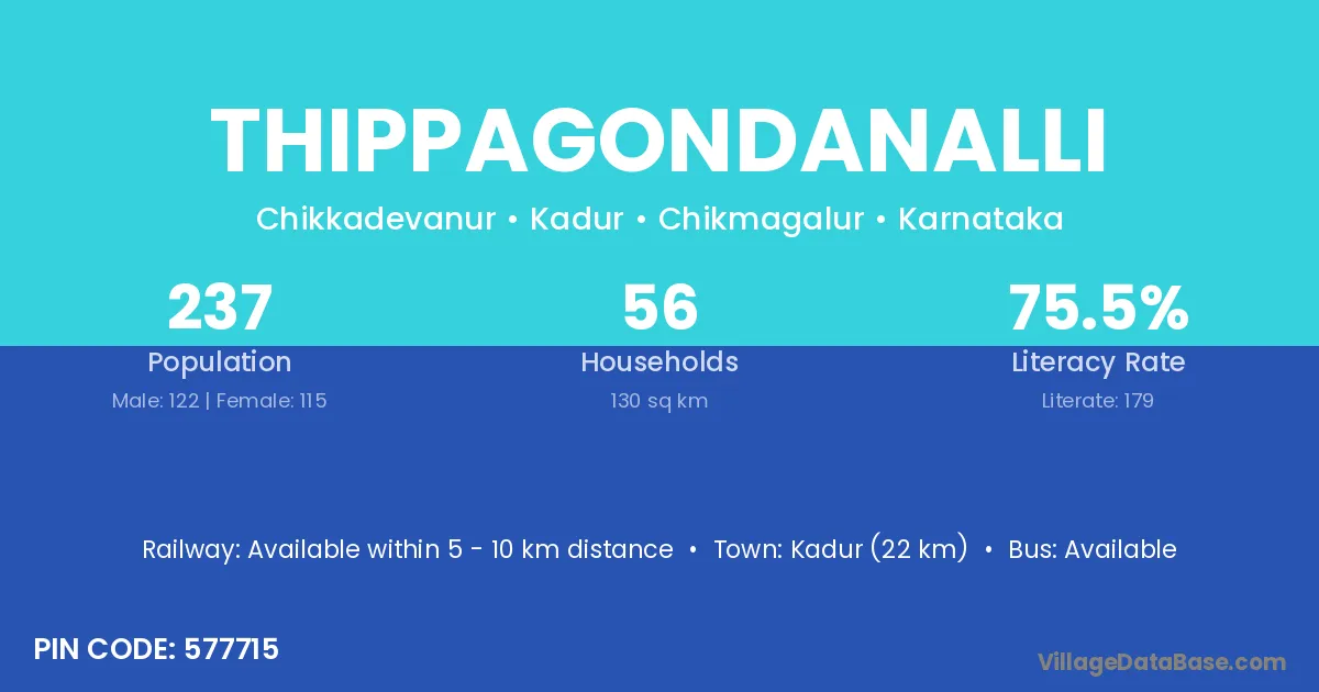 Thippagondanalli village has a total population of 237 people, of which 122 are males and 115 are females.