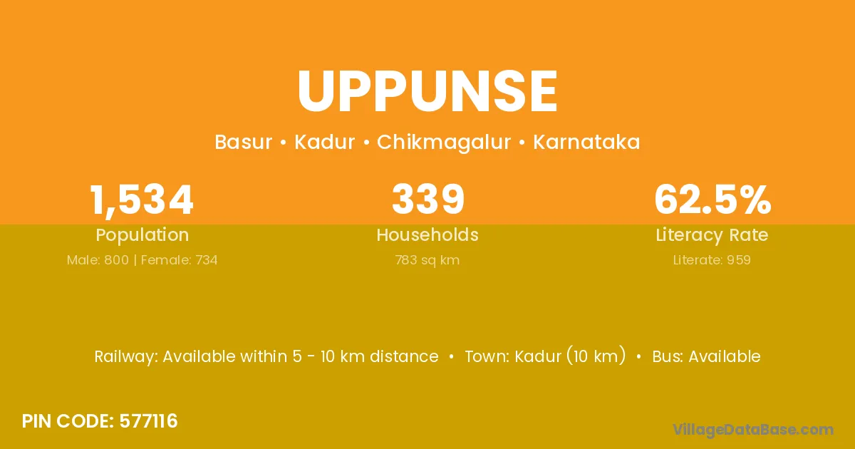 Kadur (10 km) is the nearest town to Uppunse village for major economic activities and is located approximately 10 km away.
