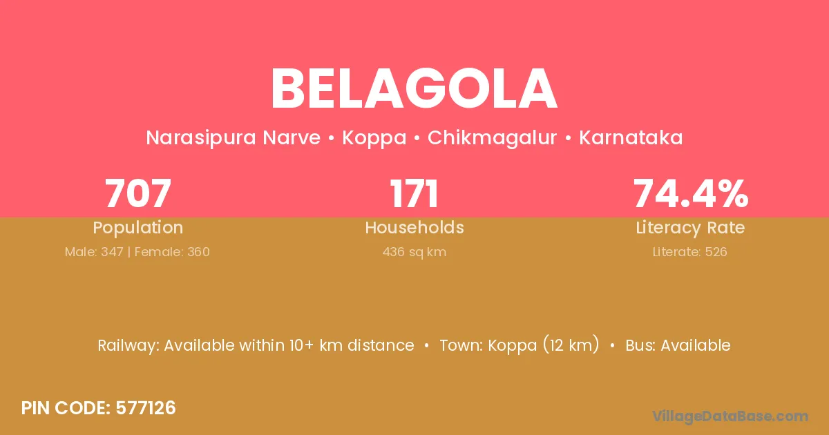 Koppa (12 km) is the nearest town to Belagola village for major economic activities and is located approximately 12 km away.