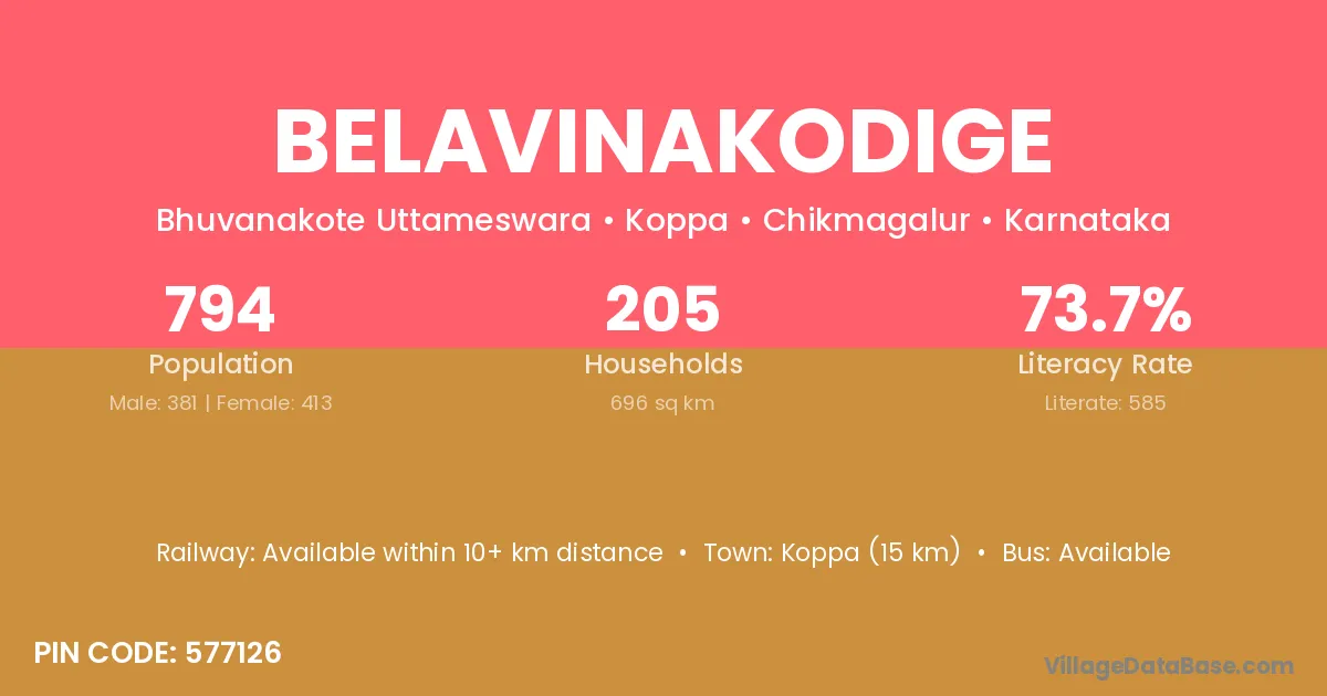 Koppa (15 km) is the nearest town to Belavinakodige village for major economic activities and is located approximately 15 km away.