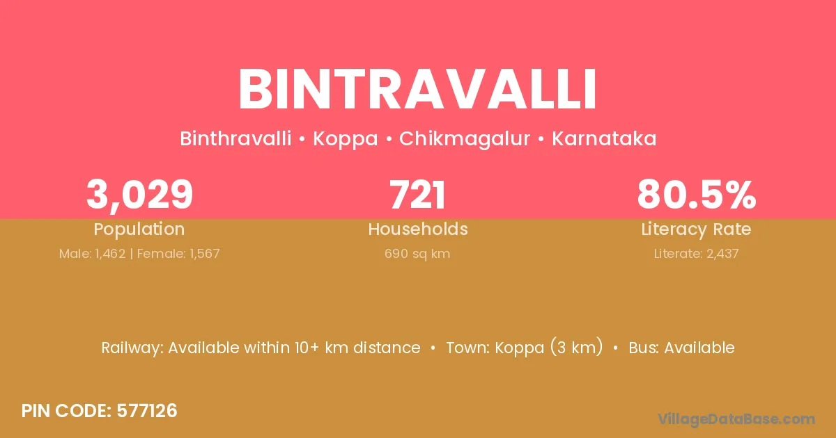 Koppa (3 km) is the nearest town to Bintravalli village for major economic activities and is located approximately 3 km away.
